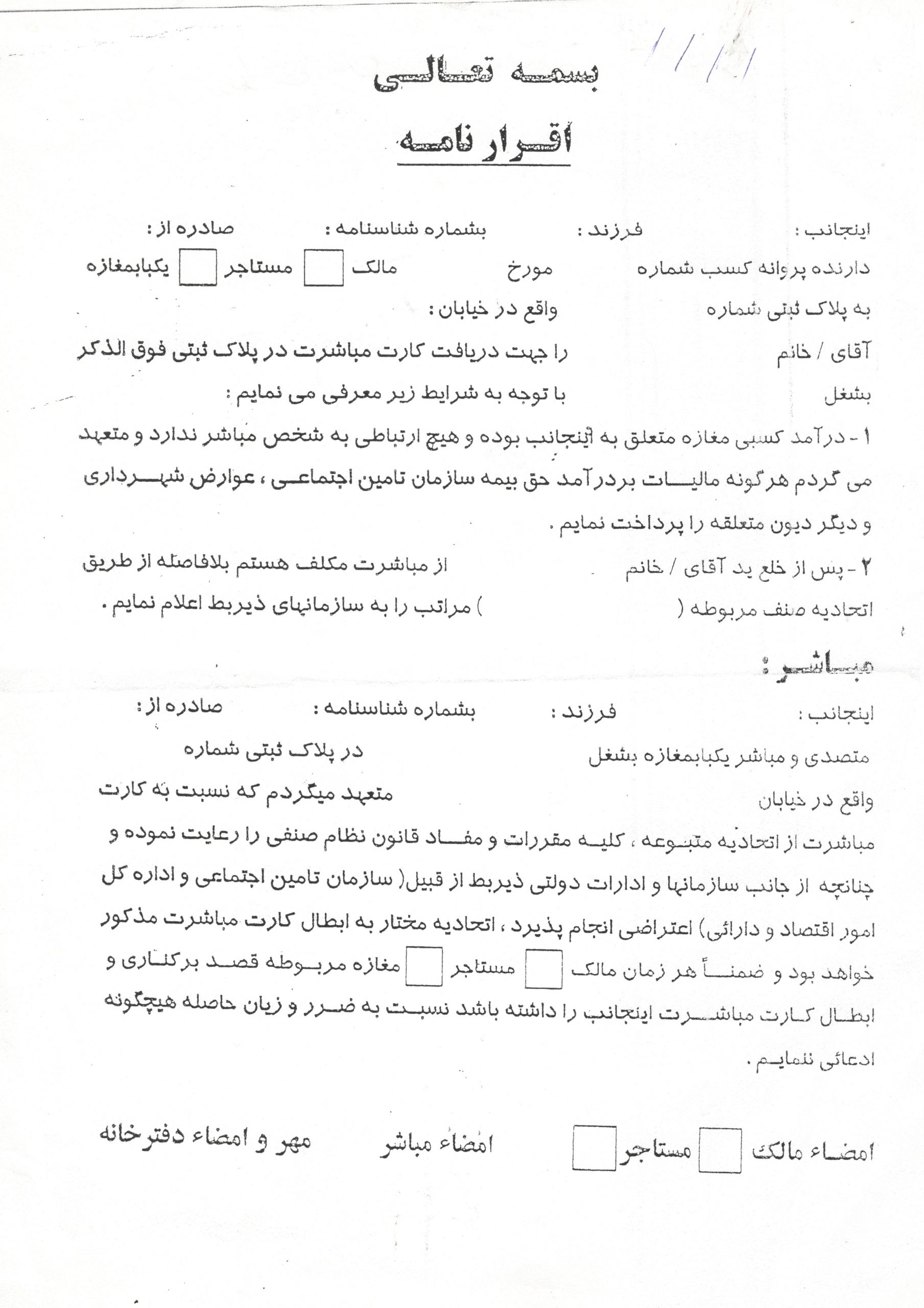 پروانه کسب نمونه فرم های مورد نیاز فرم تقاضای پروانه کسب فرم رضایت محضری شرکاء فرم معرفی مباشرت صندوق فروشگاهی - فرم دارایی فرم ثبت شکوائیه تعهد نامه برای اسم مغازه - عنوان تابلو فرم درخواست ابطال پروانه کسب